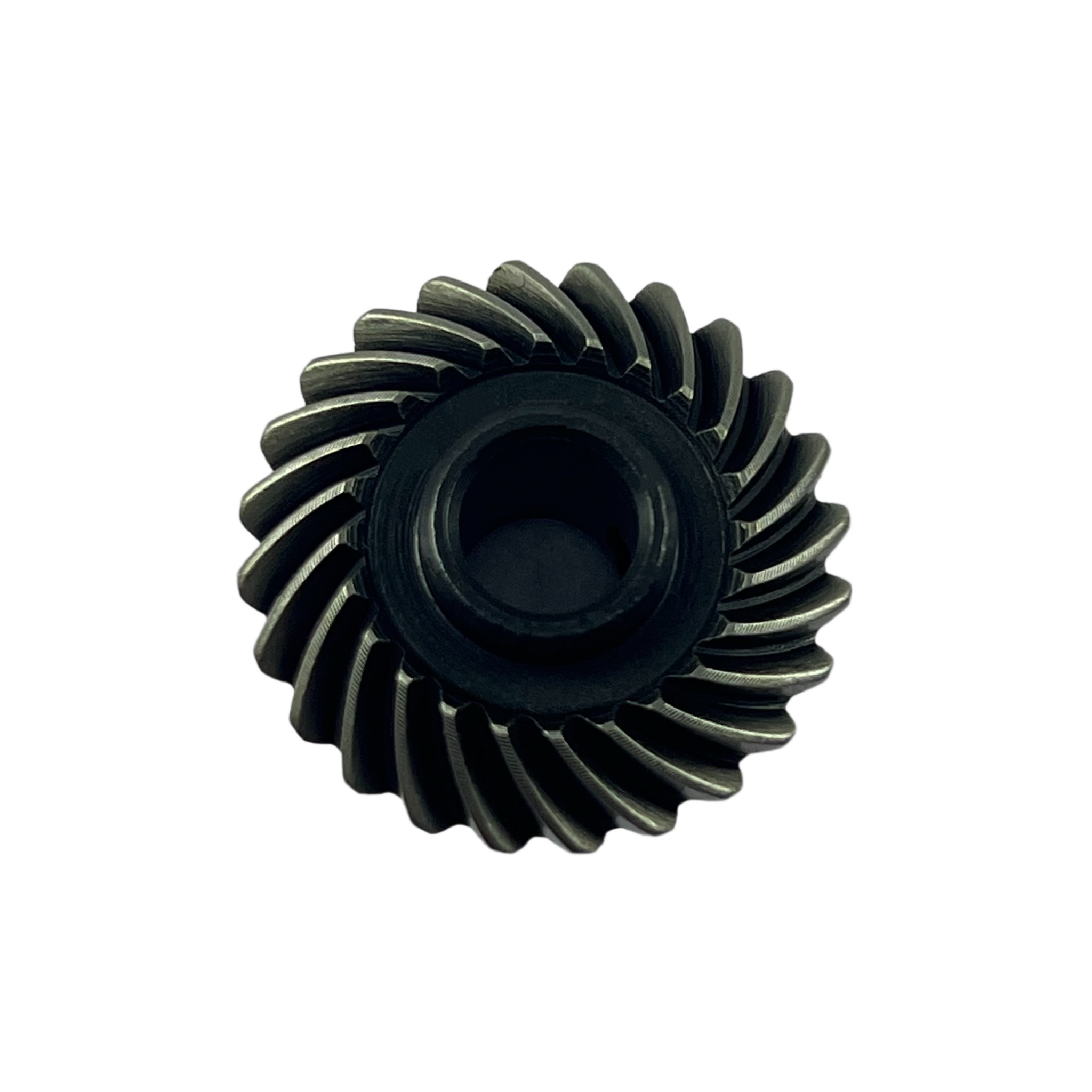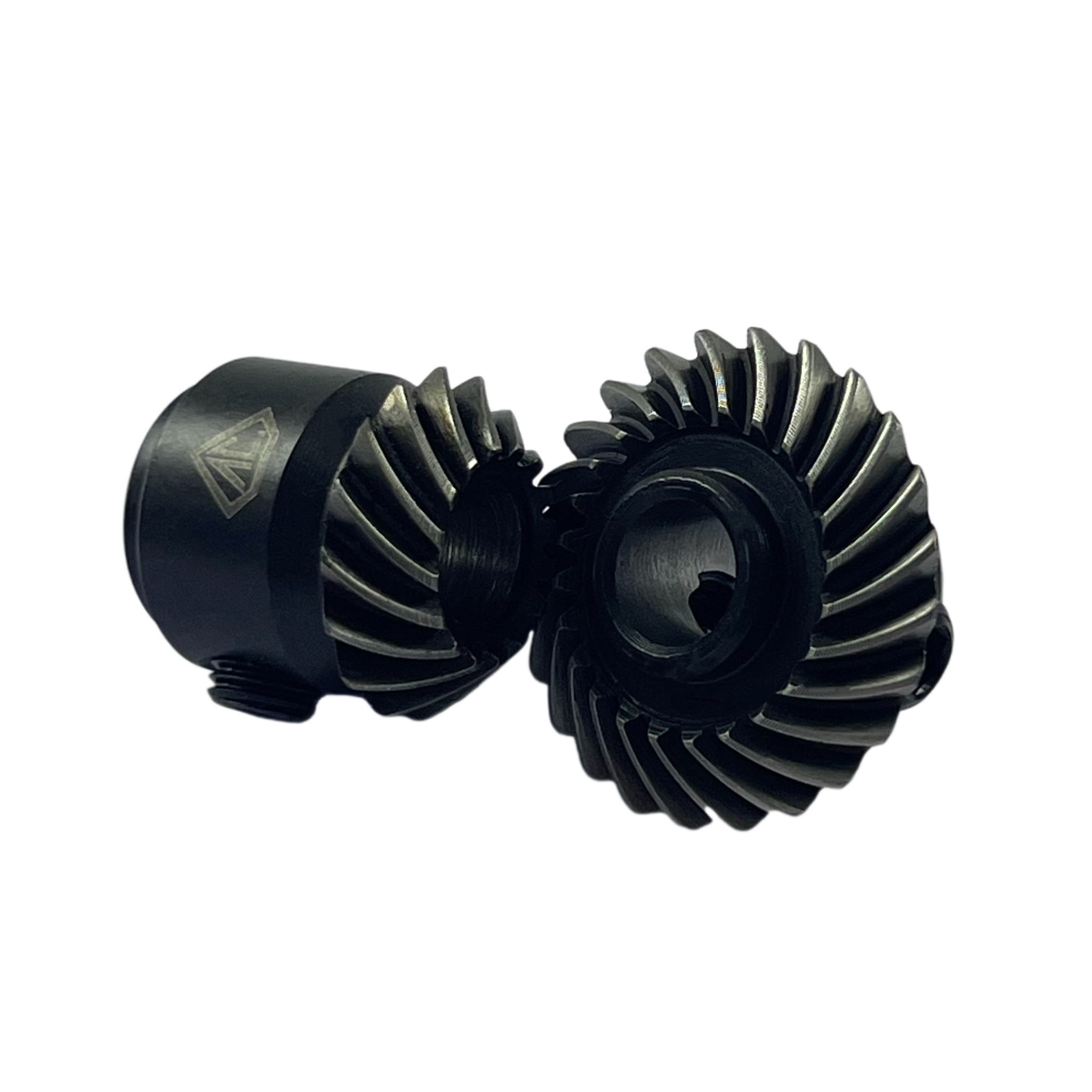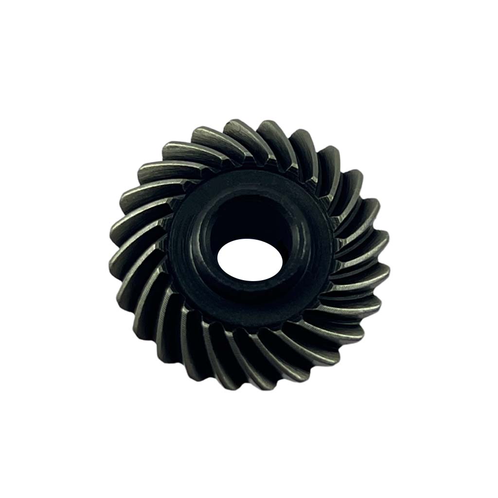 Model Countershaft Gear T24 belongs to the spiral bevel gear category, acting as the matching transmission component of Countershaft Pinion T16 for sewing machinery. It has a pressure angle of 25°, a module of 1, 24 teeth, and a spiral angle of 35° left-hand (35°/L). Regarding structural dimensions, it has an inner diameter of 7mm, an outer tooth diameter of 24.5mm, an overall length of 13mm, with a unit weight of 0.0156kg. Made of the same 20CrMo alloy steel, it adopts a precision manufacturing process: sawing → turning → threaded hole machining → reaming → gear milling → heat treatment → shot blasting → blackening → marking → reaming → screw assembly. Compared with the matching pinion, an additional marking process is added to facilitate product traceability. Cooperating with the pinion, it achieves stable power transmission and serves as a key component of the transmission system of sewing equipment.