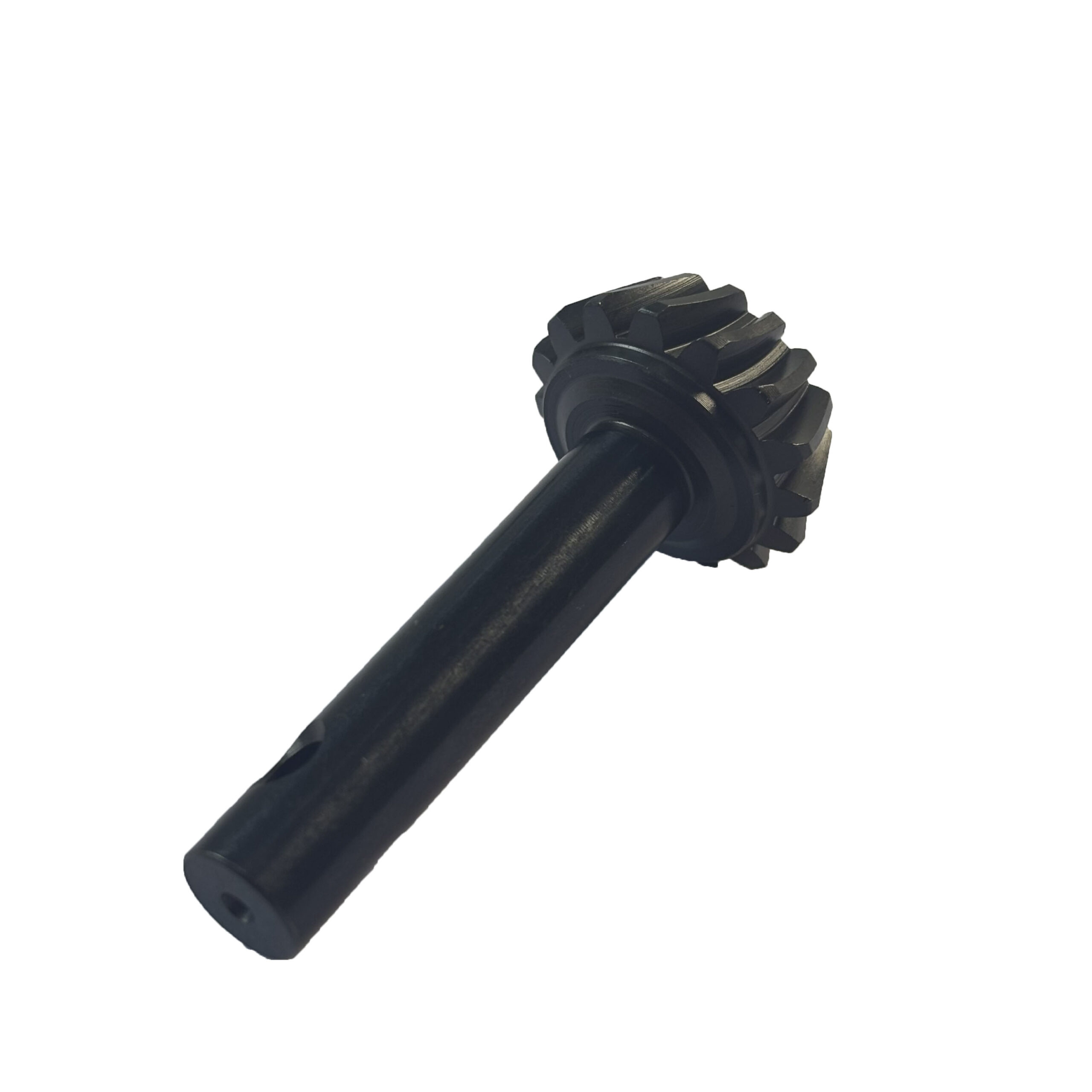 This gear features a pressure angle of 20°, a module of 1.54, 15 teeth, and a spiral angle of 10°/R. It has a shaft diameter of 10mm, an outer diameter of the tooth part of 28mm, a total length of 59.25mm, and a single weight of 0.0541kg. Made of high-quality 20CrMnTi alloy structural steel, it is precisely manufactured through a complete process route including normalizing, turning, rough grinding of clamping position, gear milling, heat treatment, shot blasting, blackening, and outer diameter grinding. Heat treatment and shot blasting processes endow the gear with excellent wear resistance and impact resistance; blackening treatment enhances the product’s rust prevention capability; the outer diameter grinding process ensures the gear’s assembly accuracy, making it suitable for high-load operation scenarios in reducer power transmission systems.